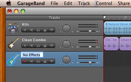 In this example I have utilized an Apple Loop drum track, 3 electric guitar tracks and a bass guitar track. All of my instruments were recorded through my Focusrite Saffire LE using the instrument inputs, or the Direct Input or DI.